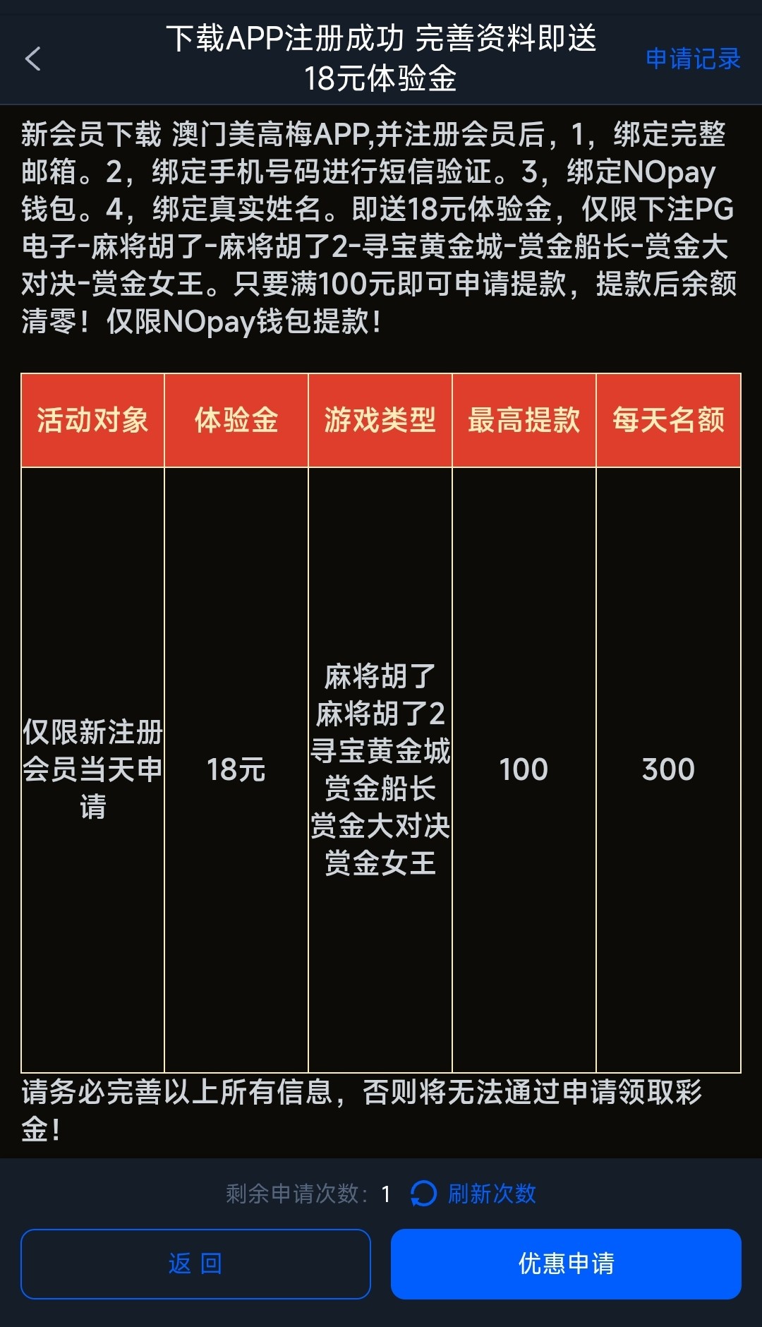下载APP注册绑定邮箱/手机号进行短信验证/NO钱包/姓名,在优惠里申请彩金,只能提款100,每天只有300名额